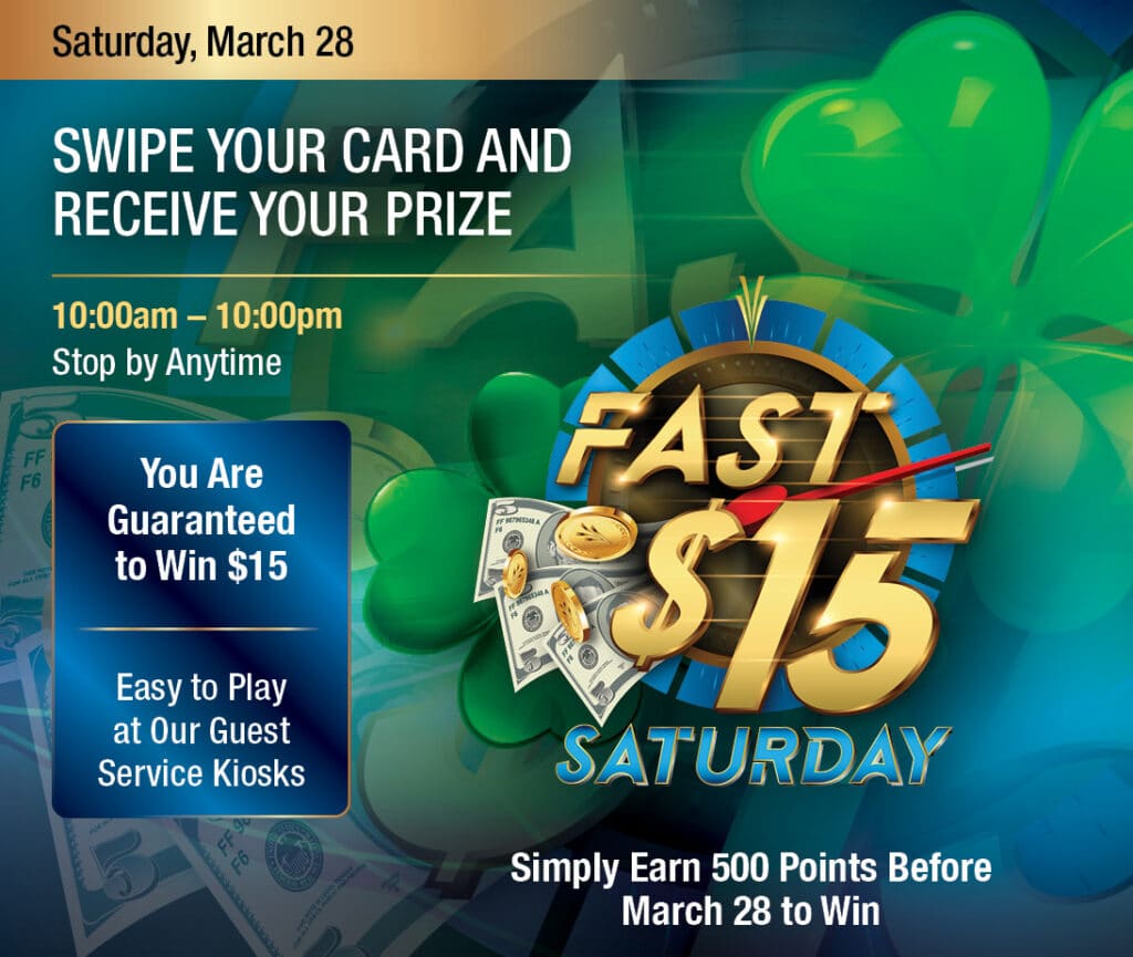 Visítenos el sábado 28 de marzo de 10am-10pm y pase su tarjeta Club de Jugadores en cualquiera de nuestros nuevos quioscos de servicio al cliente ubicados en todo el casino para recibir $15 instantemente. ¡Calificar es fácil! Simplemente gane 500 puntos en máquinas o juegos de mesa durante el mes usando su tarjeta de los jugadores cuando juegue en cualquiera de nuestras máquinas y juegos de mesa. Visite nuestro Club de Jugadores para obtener más información.