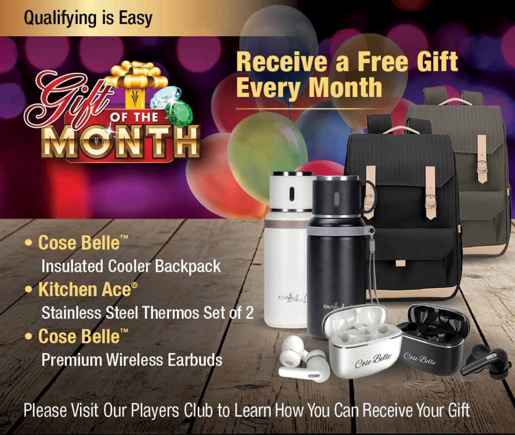 Los miembros del Players Club que cumplan con los requisitos están invitados a recibir su Regalo del Mes en determinados lunes y martes del mes de abril. Cada mes, entregamos un regalo exclusivo diferente como una forma más de agradecerles su lealtad. Este mes, usted podría llevarse a casa una mochila térmica Cose Belle™, un juego de dos termos de acero inoxidable Kitchen Ace®, unos auriculares inalámbricos premium Cose Belle™ o una tarjeta de regalo de Target por valor de $25, cortesía de Valley View Casino & Hotel.