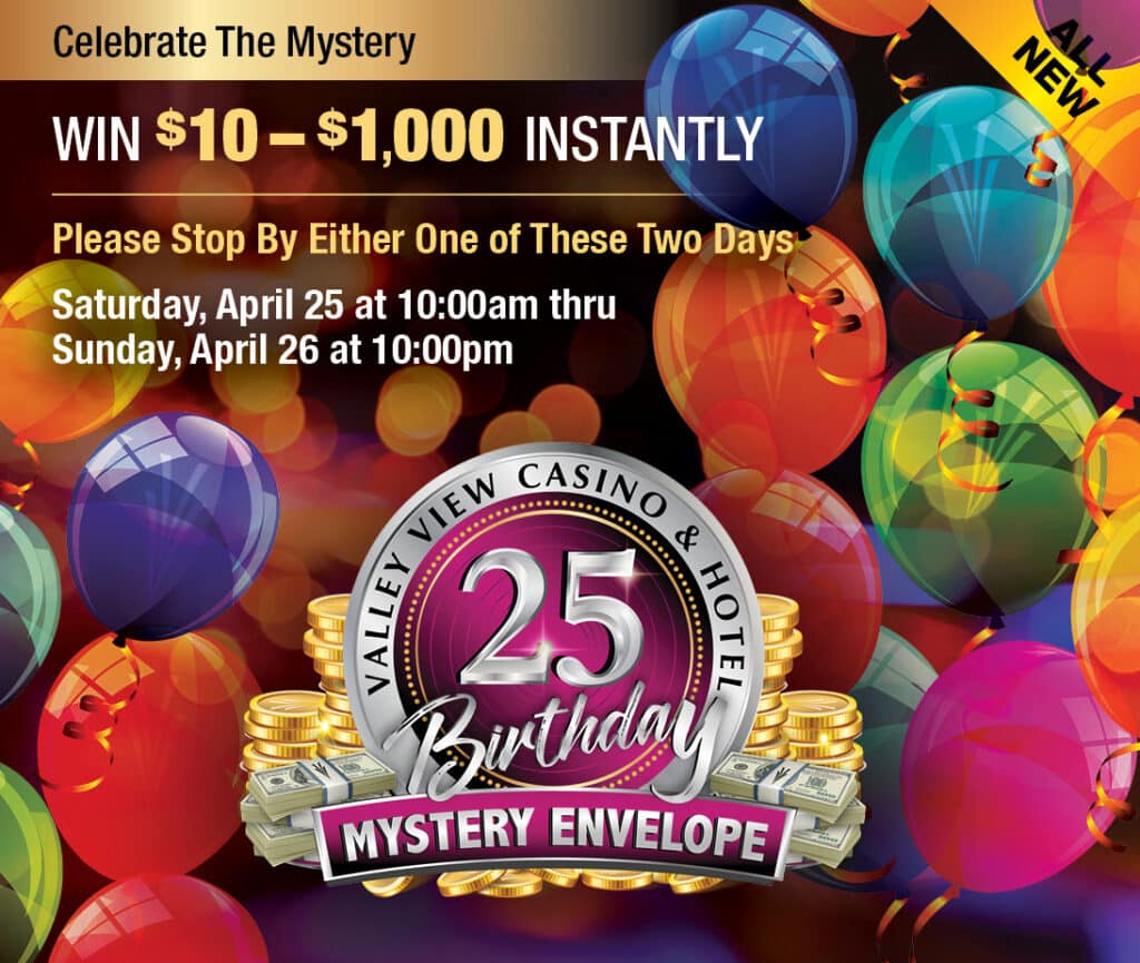 Los invitados traerán su sobre misterioso sin abrir al Club de Jugadores el 25 de april y el 26 de abril para revelar un premio de entre de $10- $1,000. Para aprender más sobre nuestra promoción del sobre misterioso y saber cómo puede participar, por favor visite nuestro Club de Jugadores.