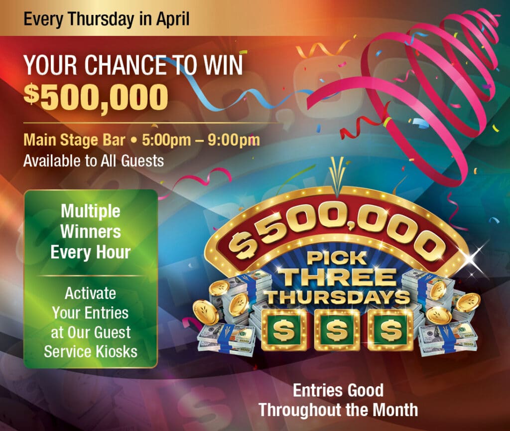 Participe en nuestra promoción $500,000 Pick Three Thursdays donde podrá ganar un gran premio. Cada hora, de 5pm a 8pm, cinco participantes ganarán MOREPLAY® y luego, a las 9pm, tres invitados seleccionarán cada uno tres sobres para tener la oportunidad de ganar $500,000. ¡Visite nuestro Main Stage Bar todos los jueves de 5pm a 9pm para ganar en grande!