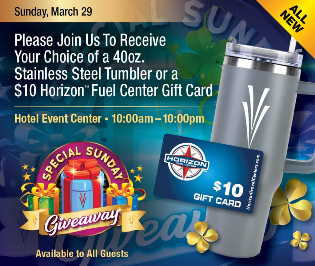 ¡Para agradecerte tu lealtad, te invitamos a unirte a nosotros el domingo 29 de Marzo para recoger tu regalo especial del Domingo! Únete a nosotros en el Hotel Event Center todo el día y la noche para recibir tu Vaso de Acero Inoxidable de 40 oz. o una tarjeta de regalo de $10 de Horizon Fuel Center, cortesía de Valley View Casino & Hotel.